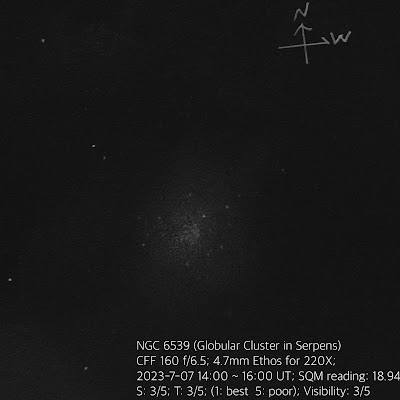 NGC 6539 的外觀分類是很鬆散的 Class X,不過平地屋頂用 16 公分鏡也拆不出什麼星點,勉強可以看到靠核心 北北西方 有幾粒零散的星點而已,星團整體看起來的感覺就是大、質地鬆散、雲氣淡淡的模樣。